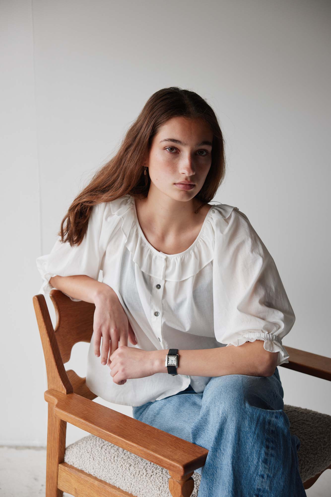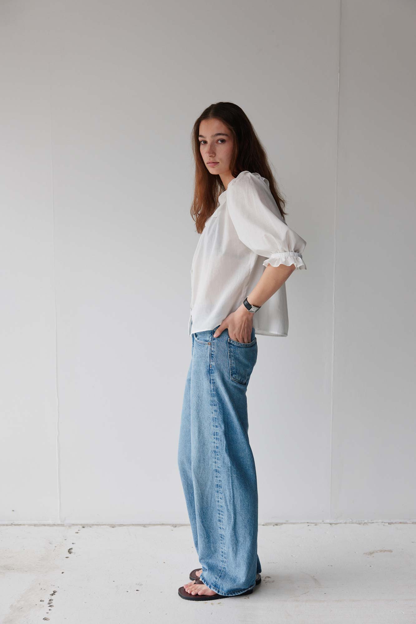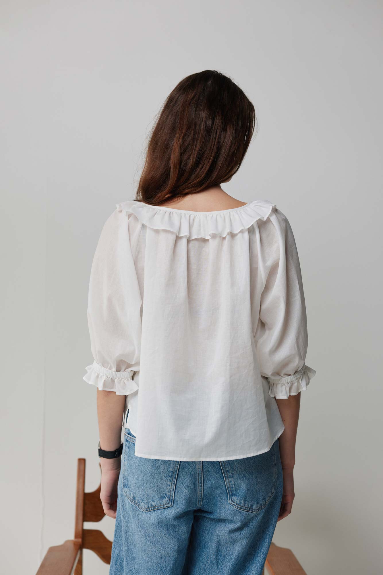 A cropped, short-sleeve blouse with a gathered scoop neckline, soft mini ruffle detail and relaxed raglan sleeves. French seams, shell buttons and a gently undulating hem with side splits add subtle refinement and ease. Crafted in soft, breathable natural fibres, it pairs effortlessly with denim, the Field Skirt or your favourite relaxed pant or skirt.