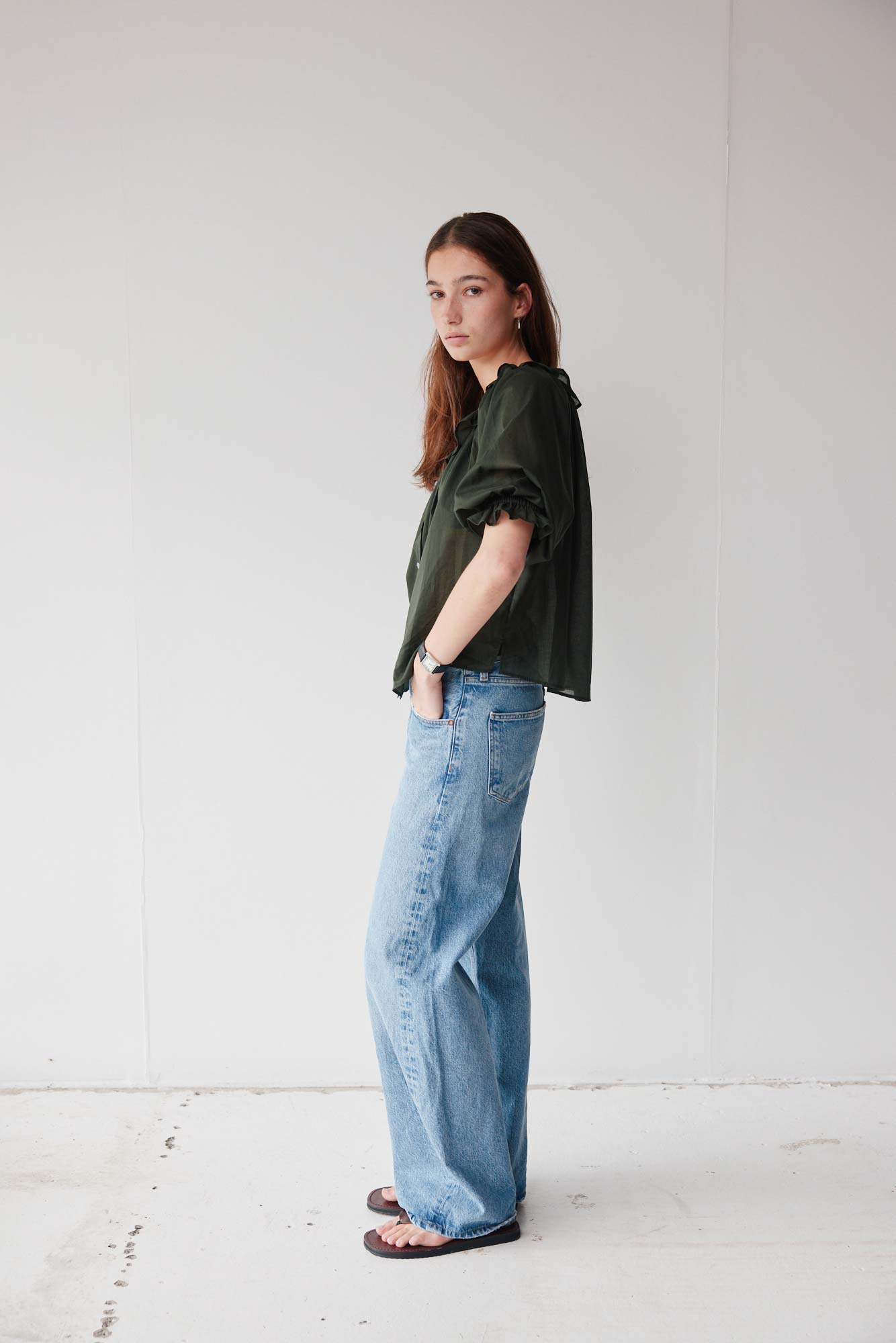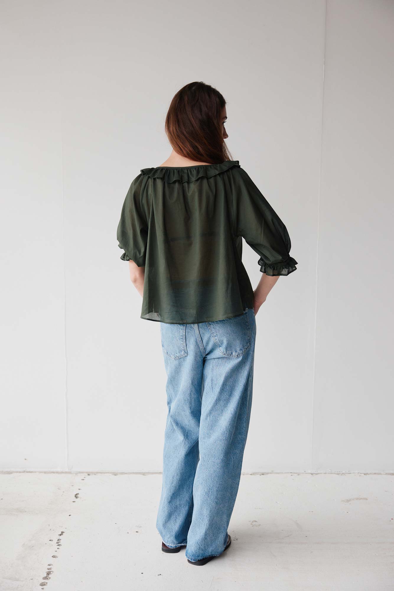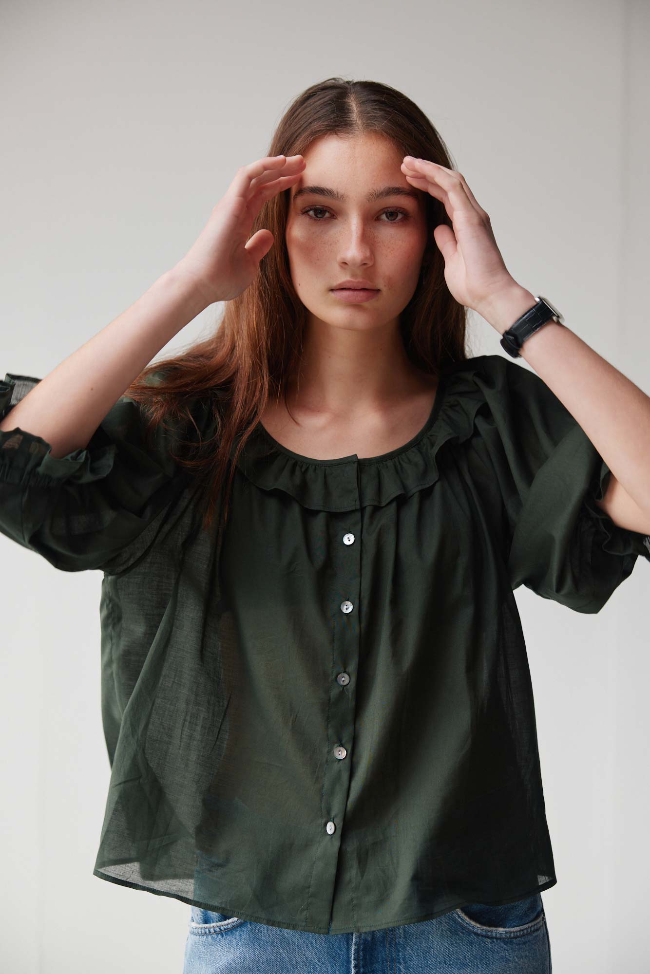 A cropped, short-sleeve blouse with a gathered scoop neckline, soft mini ruffle detail and relaxed raglan sleeves. French seams, shell buttons and a gently undulating hem with side splits add subtle refinement and ease. Crafted in soft, breathable natural fibres, it pairs effortlessly with denim, the Field Skirt or your favourite relaxed pant or skirt.