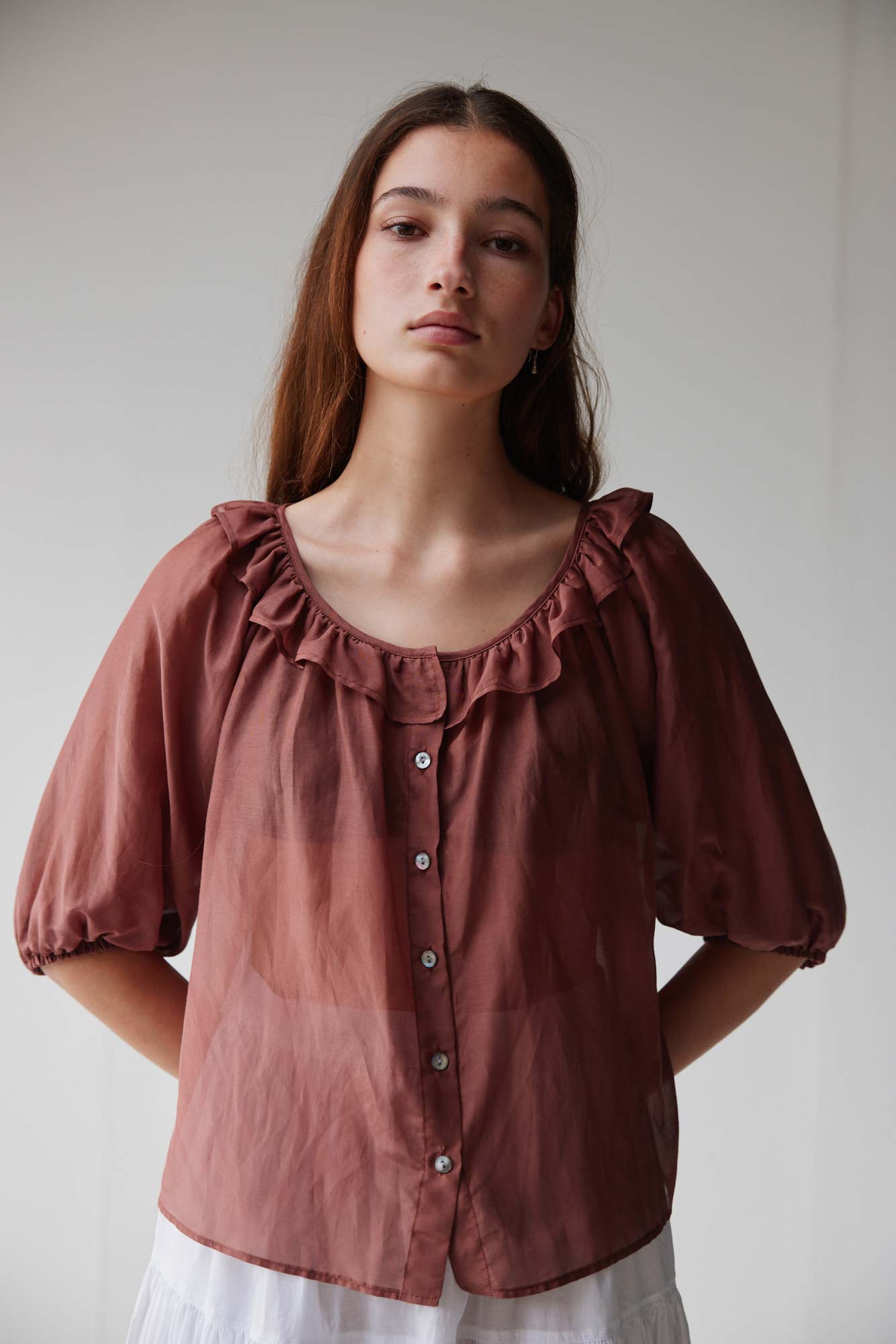 A cropped, short-sleeve blouse with a gathered scoop neckline, soft mini ruffle detail and relaxed raglan sleeves. French seams, shell buttons and a gently undulating hem with side splits add subtle refinement and ease. Crafted in soft, breathable natural fibres, it pairs effortlessly with denim, the Field Skirt or your favourite relaxed pant or skirt.