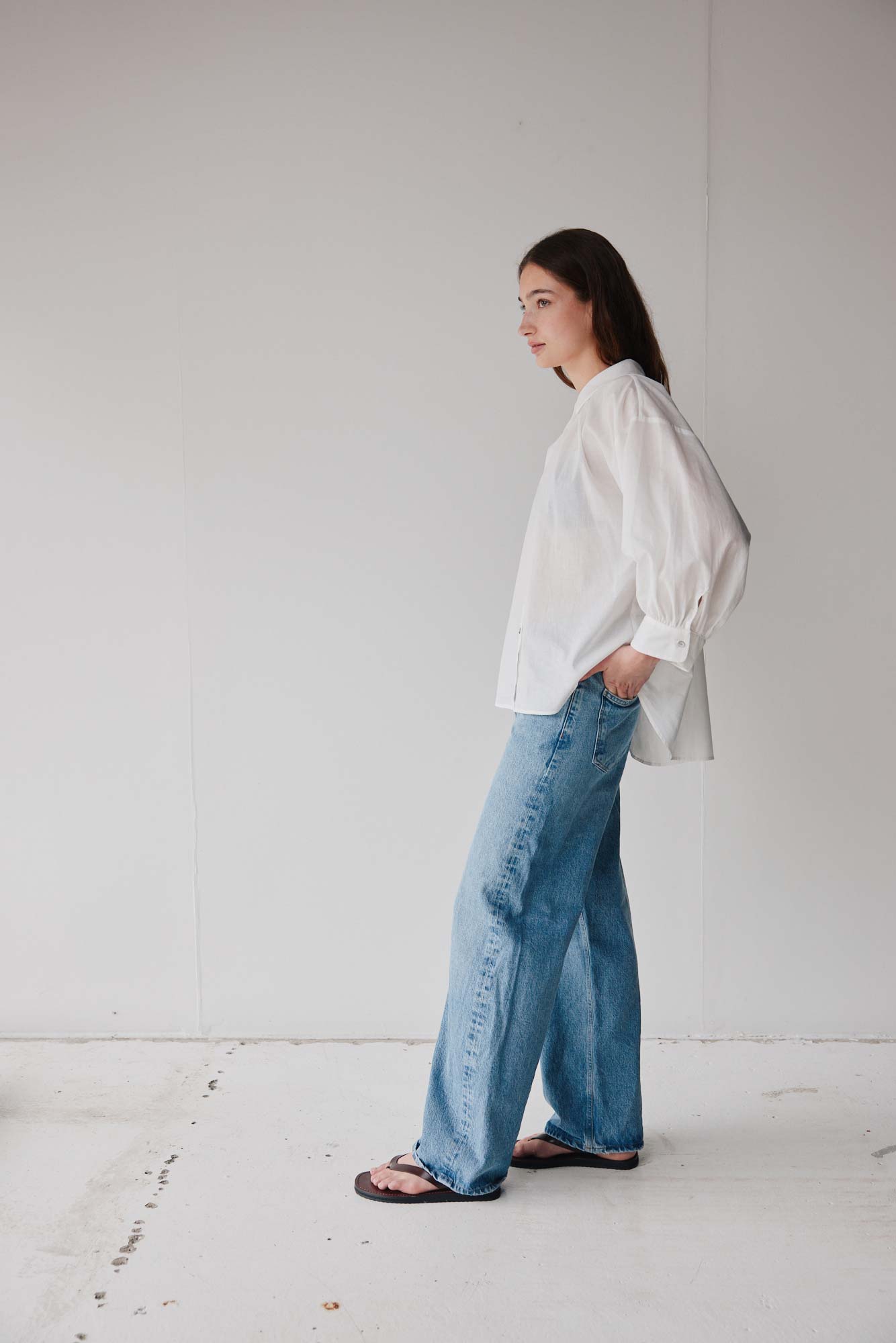 A relaxed-fit shirt with soft volume and ease. The curved one-piece club collar offers a subtle nod to the Peter Pan collar, while the clean stitched placket keeps the silhouette simple. Sleeves gather into a curved cuff, and the back hem dips gently, creating a modern, romantic shape. Finished with French seams, fine topstitching and shell buttons. Perfect with your hero denim.